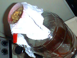 The ginger ale gets strained into the glass bottle. Note the chunks of ginger being strained out. Also getting caught are lemon slices.
